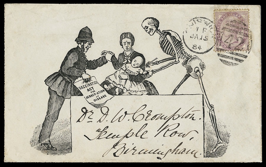 1884 printed British propoganda cover, created at a time when there was widespread fear of vaccination. Text reads "Vaccination Act for Jenner-ation of disease".