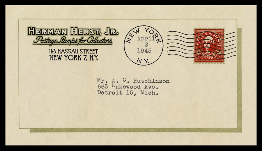Letterhead of stamp dealer and writer Herman Herst, 1945, with simulated cover and facsimile stamp design