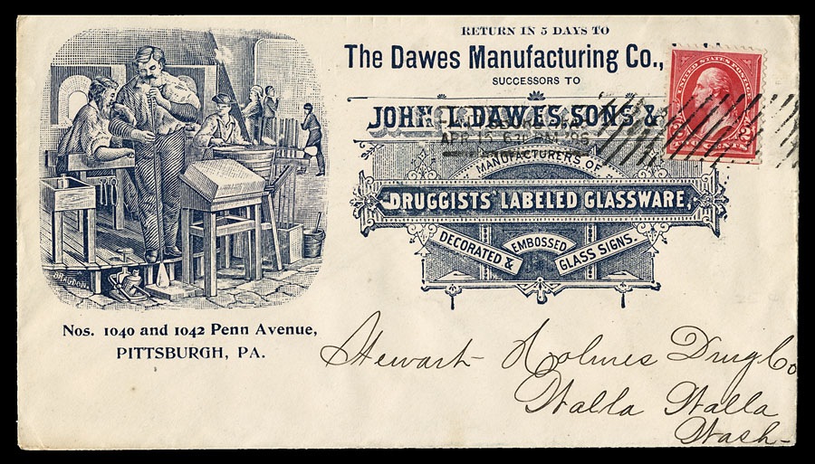 Advertising cover for a glass manufacturer, 1896. Interestingly, the blower has a foot pedal to control the opening and closing of a mold.