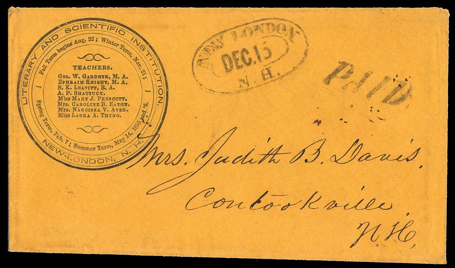 Advertising stampless cover, 1855. Contains a student's attendance record.