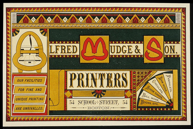 Trade card. Note the depiction of a printing press at the left, rendered entirely in brass rules. (not in RDS collection)