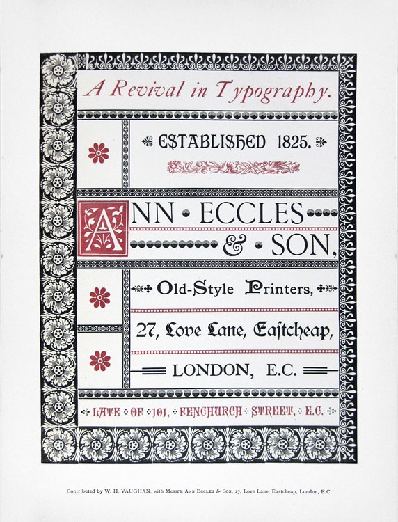 some printers—primarily in England—favored a revival of earlier, traditional typefaces and border treatments. This one, quite elegant, is unusual