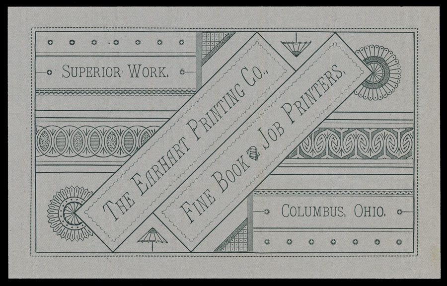 Trade card design by John F. Earhart , in the Printers International Specimen Exchange, 1883 ( see also previous item )
