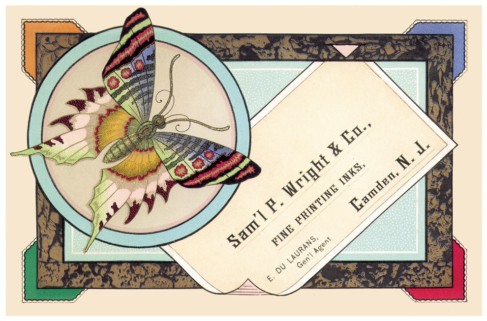 Trade card printed in twelve colors plus metallic "gold" by John F. Earhart; border is Earhart's "Chaostype"