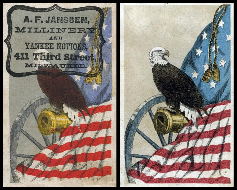 These chromolithographed cards were sold (15¢ each, 8 for $1, 10¢ each in quantities over 100 ) to benefit the Permanent Soldiers' Home in Milwaukee.