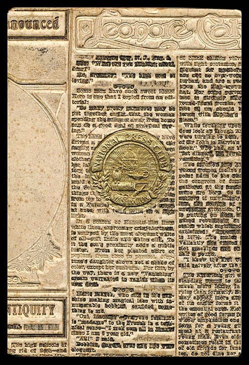 Back cover of small, hardbound book, 1914. Covers are actual pieces of mat / flong