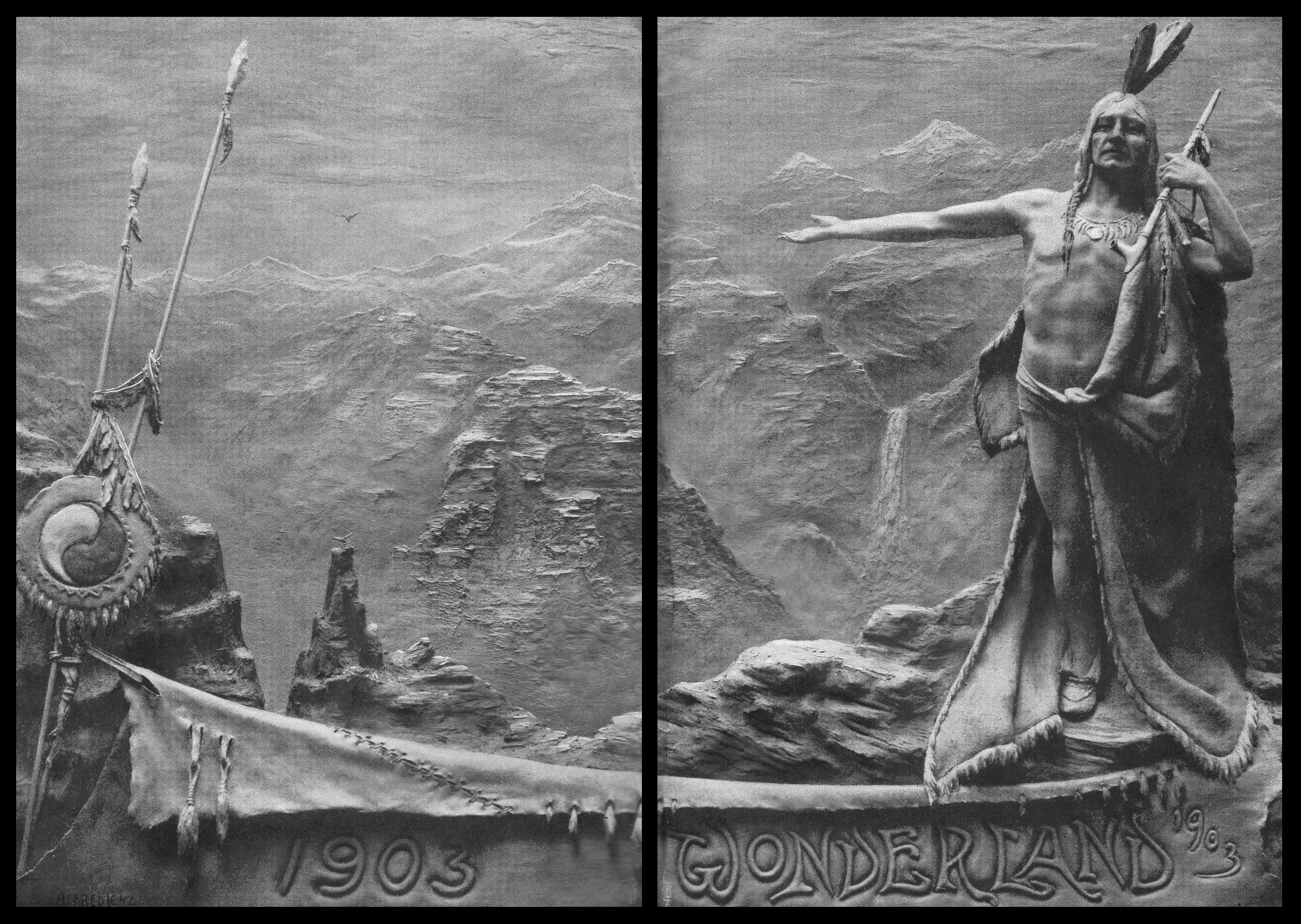 Booklet covers. From 1884 through 1914, the Northern Pacific Railway published a promotional booklet each year extolling the wonders of the Yellowstone National Park. The booklets for 1900 through 1903 featured modelled clay covers, as well as several modelled section headers inside. (Courtesy of SharingHistory.com)