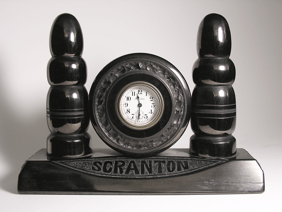 Mantle clock carved of anthracite coal, 12" wide, 8 1/2" tall. Everything except the central clockworks is coal.