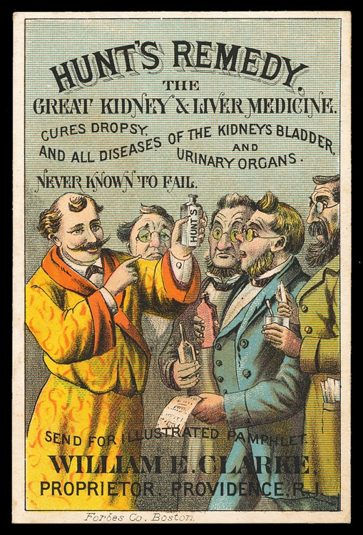 Trade card, showing doctors amazed by Hunt's Remedy. Printed by Forbes, Boston.