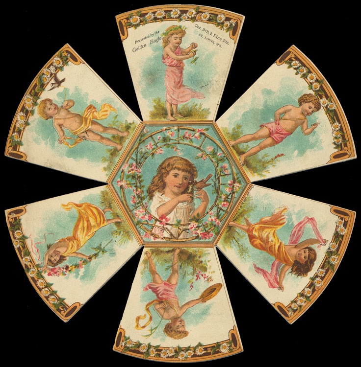 Unusual, large (9 inches wide) trade card, 1883, with panels made to be folded up to form a basket, with a string run through small holes in the upper corners.