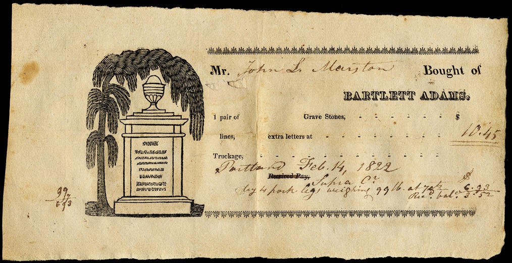 1822 This gravestone was paid "by pork legs weighing 99lbs at 7¢ lb" plus a cash balance of $3.52. ( see next item )