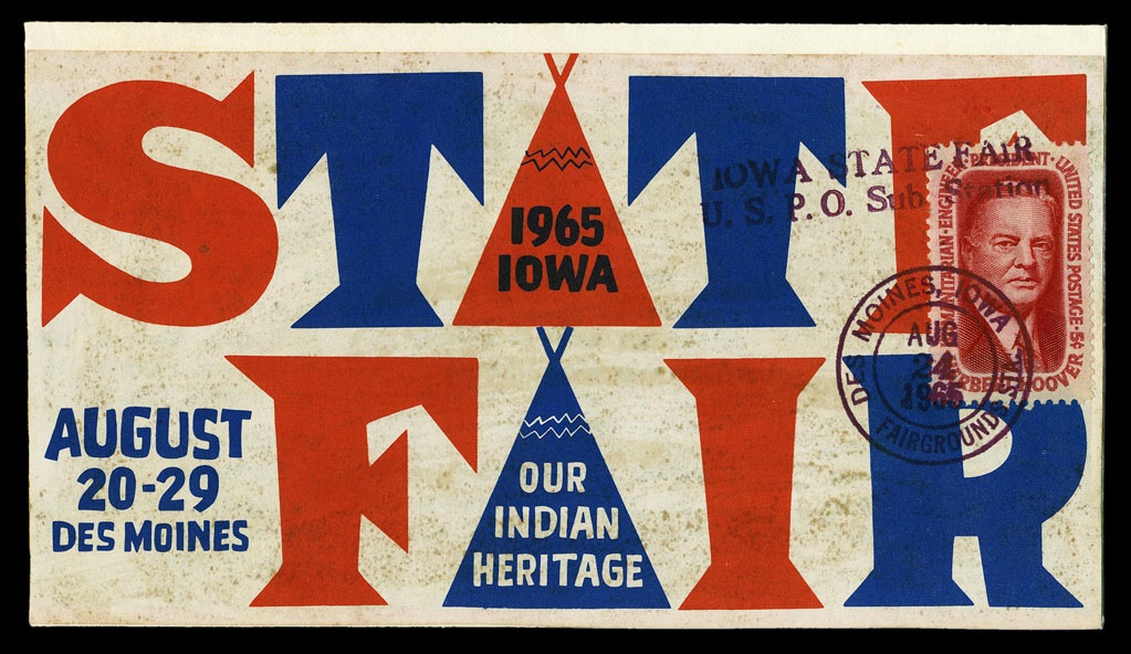A cover made by affixing a colorful printed cutout with graphic type to the envelope face, then having it cancelled on the fairgrounds.