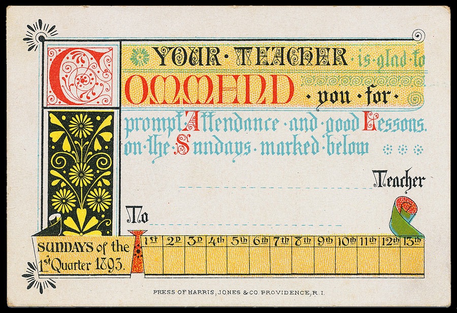 Sunday school attendance card, 1893. Printed by Harris, Jones & Company, Providence