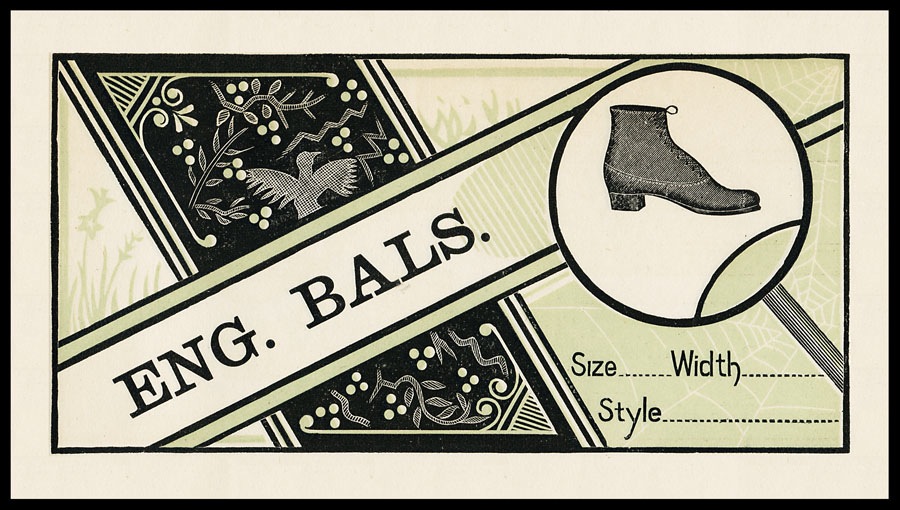 Sample shoe label, in 1800s specimen publication by printer G. A. Goodall of Brockton, Massachusetts,