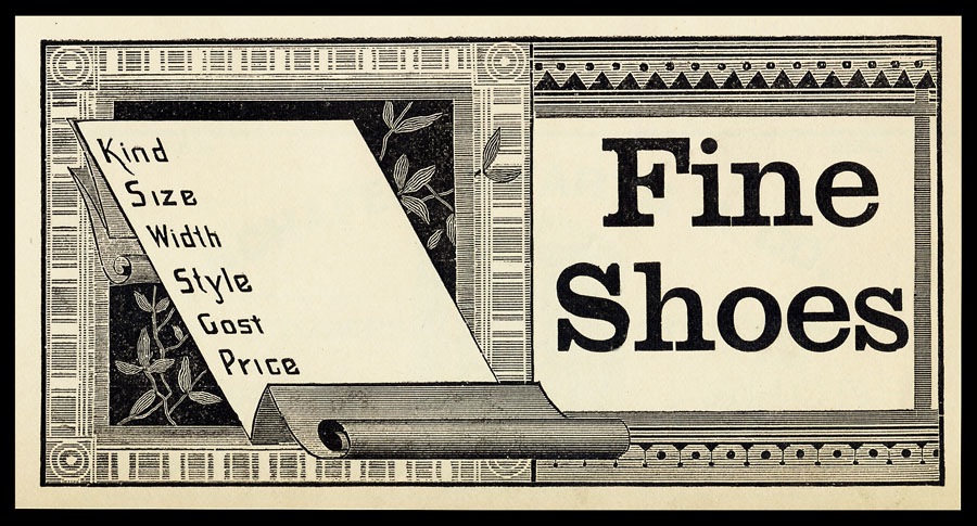 Sample shoe label, in 1800s specimen publication by printer G. A. Goodall of Brockton, Massachusetts,