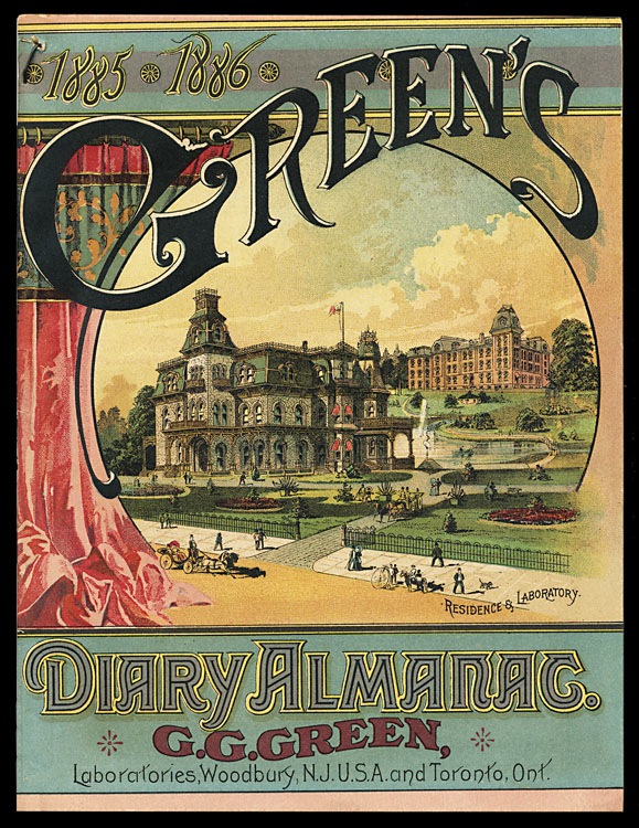 Almanac cover, 1885-1886. The rear cover features an image of Dr. Green's steam yacht G. G. Green, Jr.