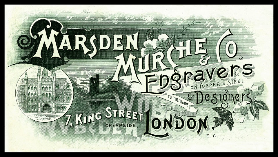 Engraved trade card. This card has a touch I'd not seen before: the company name is shown refected upside down in the water at the bottom,