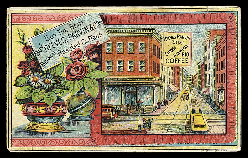 Stock trade card, imprinted for a coffee company. Printed by Crump Label, NY.