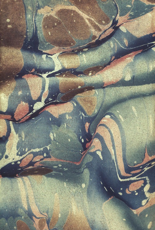 Early Spanish pattern, in a book bound in Madrid, 1804. A Turkish patterned design floating on size was moved as paper was laid upon the design.