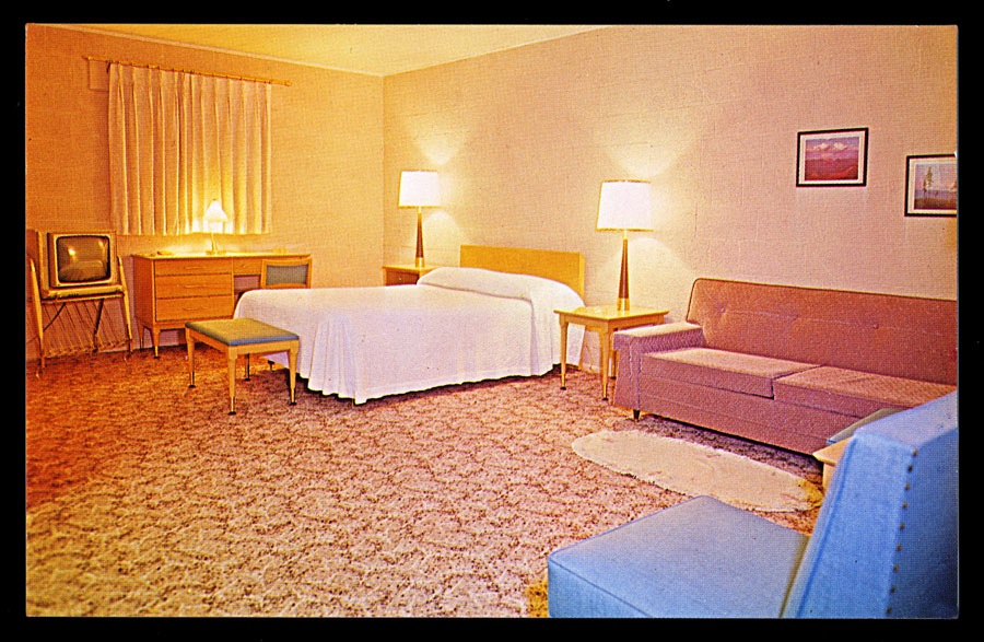 I like postcards showing empty, sterile 1950s and 1960s rooms . . . motel rooms, hospital rooms, household rooms.