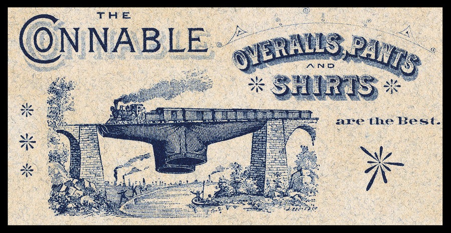 A normal locomotive crossing a fantasy exaggeration bridge made of stretched pants.
