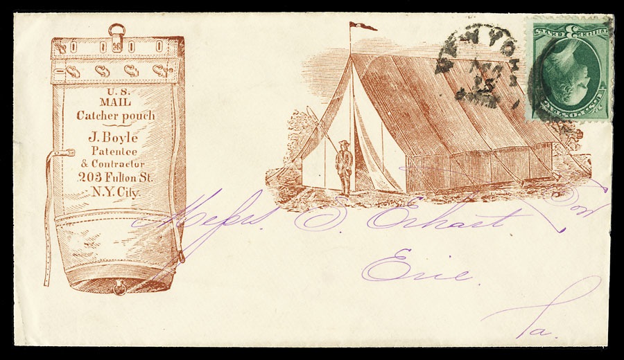 Advertising cover for a "catcher pouch", made to be hung on a hook and snagged by a passing train without stopping.