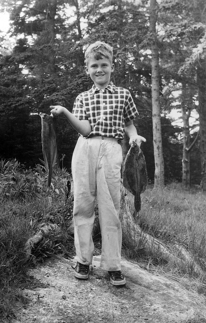 Dick Sheaff with flounder, Salart cottage, Chamberlain (Long Cove), Maine ca1952
