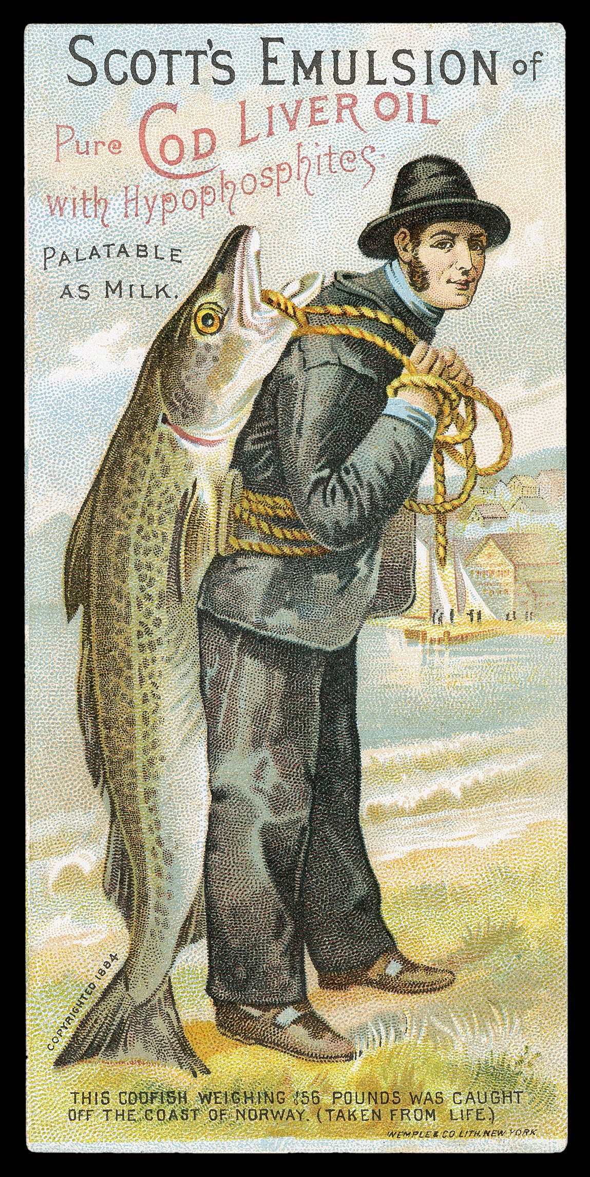 Trade card for Scott's emulsion printed by Wempler & Company Litho, NY. This man-with-fish-on-back was copyrighted by Scott & Bowne, NY as a logo.