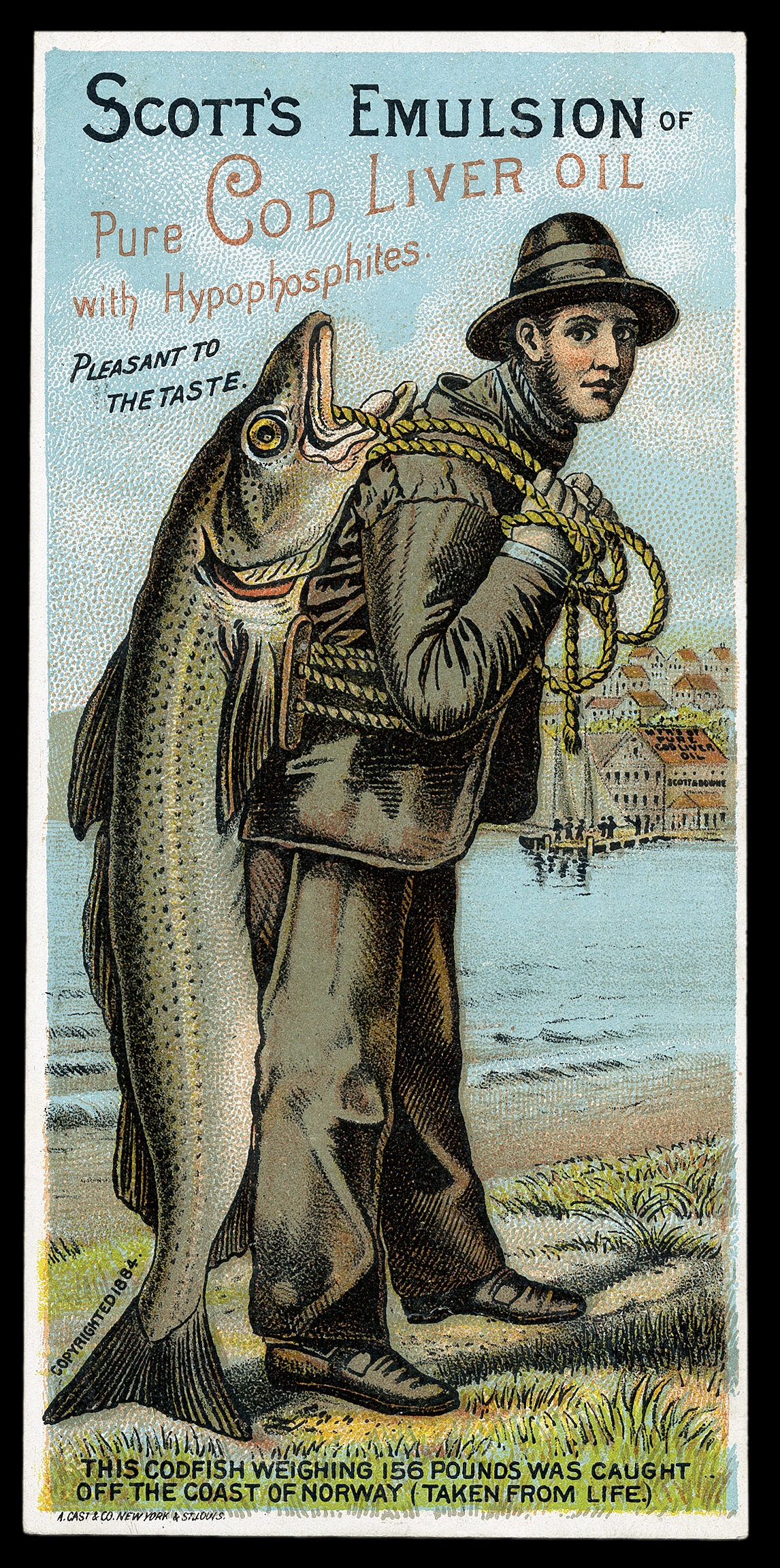Another trade card for Scott's emulsion, printed by A. Cast & Company Litho, NY. This man-with-fish-on-back was copyrighted by Scott & Bowne, NY as a logo.