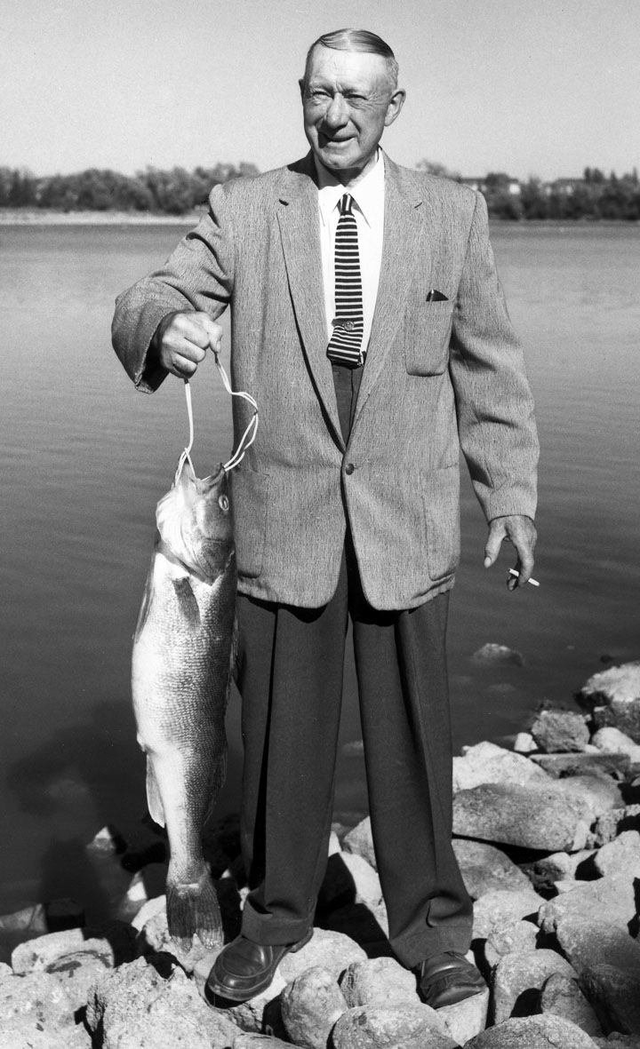 "Frank Derbyshire of Regina, holding his prize 9-pound, 4-ounce derby winning pickerel (Walleye),