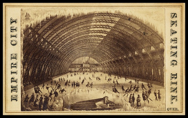 Back has extensive text about the "LARGEST RINK IN THE WORLD" in New York City, including lists of trustees and officers.