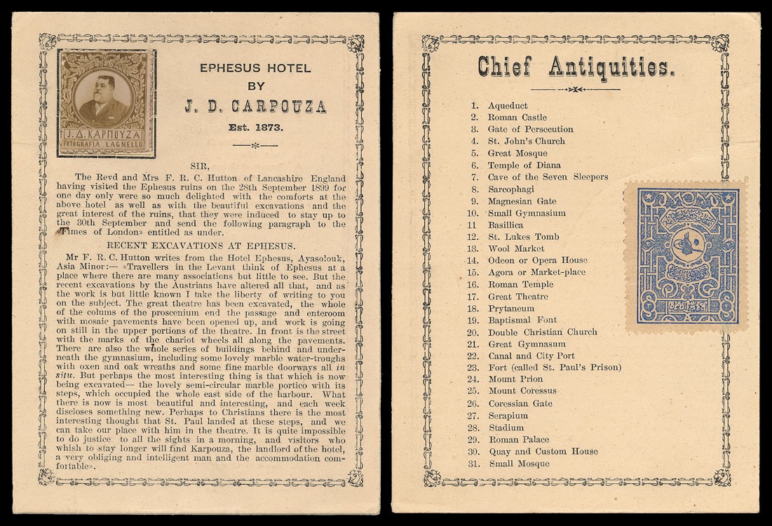 Promotional piece for a hotel in Turkey, with a photo-stamp picture of the proprietor and a Turkish tax stamp