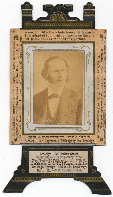 Diecut trade card. Dr. T. DeWitt Talmage, Pastor of the Brooklyn Tabernacle, is pictured and gives a testimonial