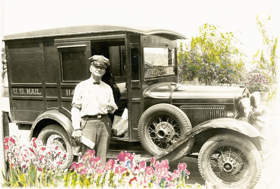 Mailman and his delivery truck, hand-painted flowers in the foreground