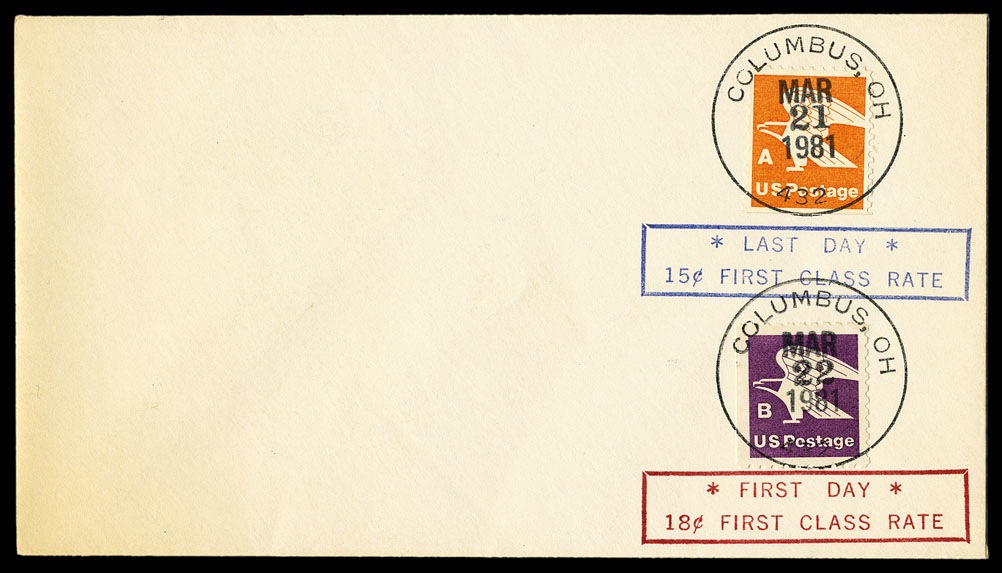 A cover bearing last day of rate usage of the "A" stamp, combined with first day of usage of the "B" stamp