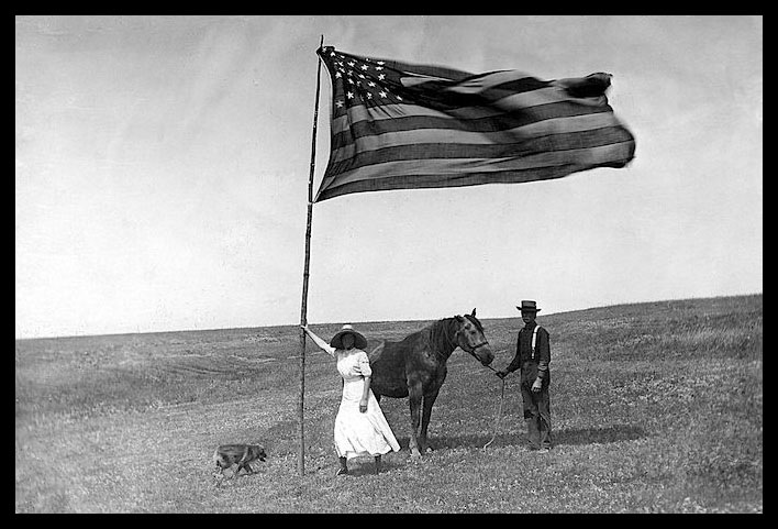 A flag planted on the prairie. The people are identified as Ellen and Papa, 1912.