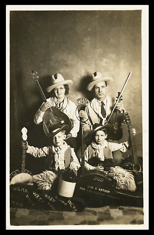 Real photo postcard, radio station WHIO microphone. The boys' backup band members were probably their parents.