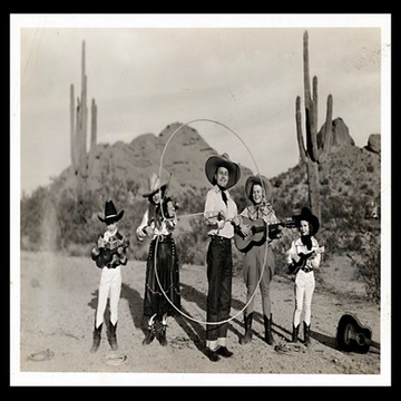 Real photo postcard of a family western band, complete with spinning rope. It would seem that the entire family could also do rope spinning and/or other tricks,