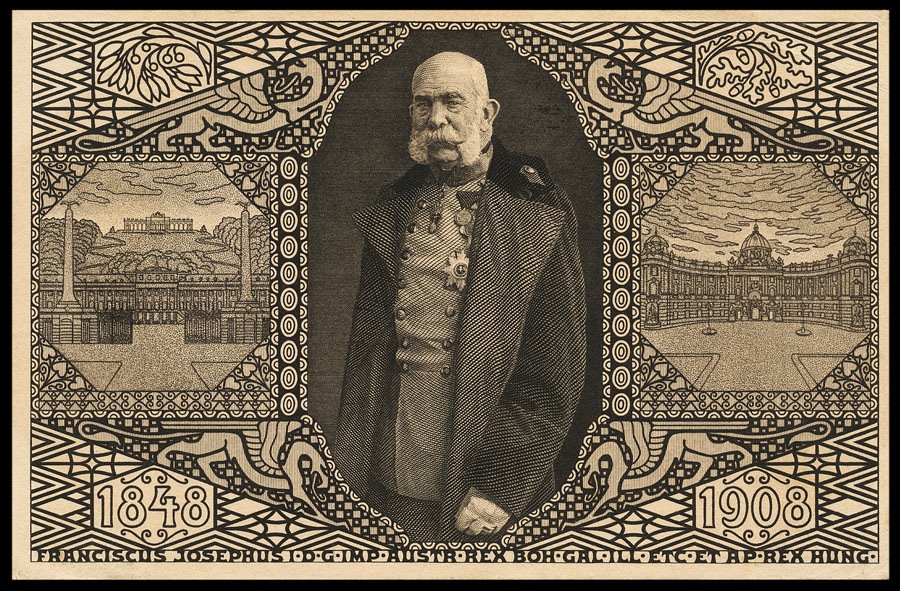 A steel engraved postcard, 1908. "Franz Joseph I or Francis Joseph I was Emperor of Austria, King of Bohemia, King of Croatia,