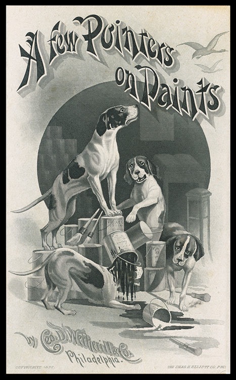 A fine example of a steel engraved trade card, showing the visual pun "A Few Pointers On Paints".