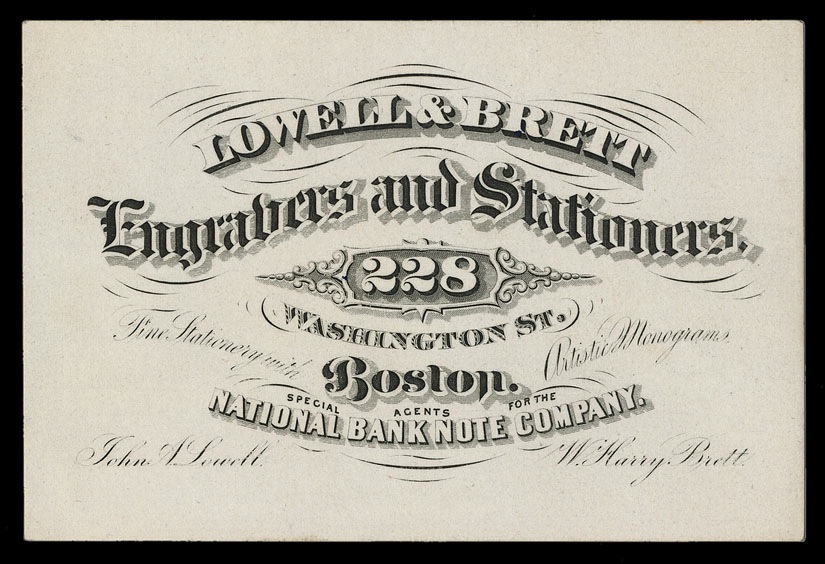 Engraved trade card. "Agents for the National Bank Note Company"