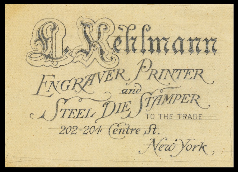Original hand-lettered pencil layout for a trade card for a New York engraver, printer and steel die stamper