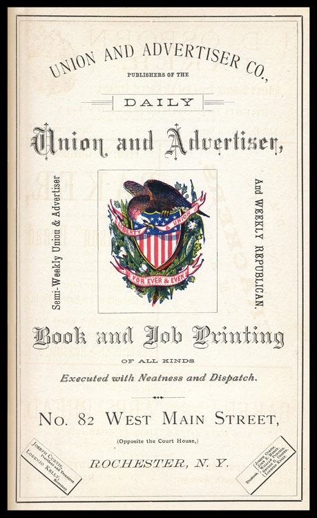 Full page advertising insert on card for a Rochester, NY newspaper publisher and book & job printer