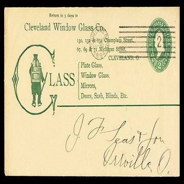 Advertising cover, 1894, showing a glass repair man on foot with a rack of variously sized pieces of glass on his back.