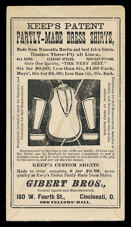 Advertising cover (back), 1877, by an agent for Keep's Patent Partly Made Dress Shirts. What a concept.