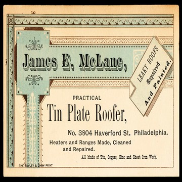 Trade card printed by Rowley & Chew. An ornate Artistic Printing card for a working client (rather than for the printer himself), a roofer.