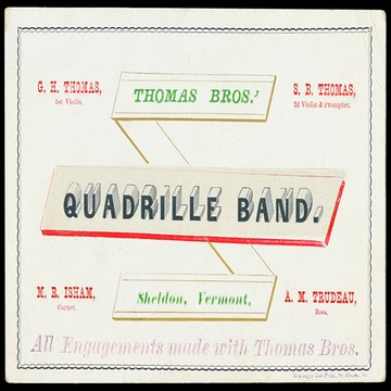 Trade card on coated stock, printed by Messenger Job Print, St. Albans, Vermont