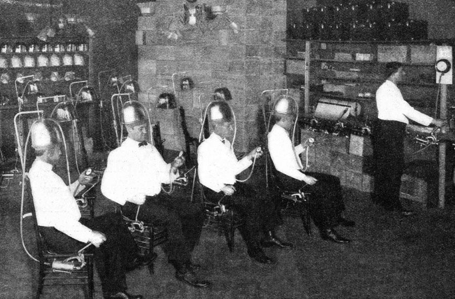 From a 1907 advertisement. "A significant feature which arises in connection with this picture is the fact that the men who are testing these Caps