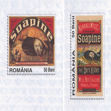 Details of two items of postal stationery from Romania, 2006, each featuring an American Soapine trade card