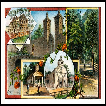 A decorative multi-view chromolithograph, which demonstrates many of the Victorian techniques of layering elements and suggesting depth.